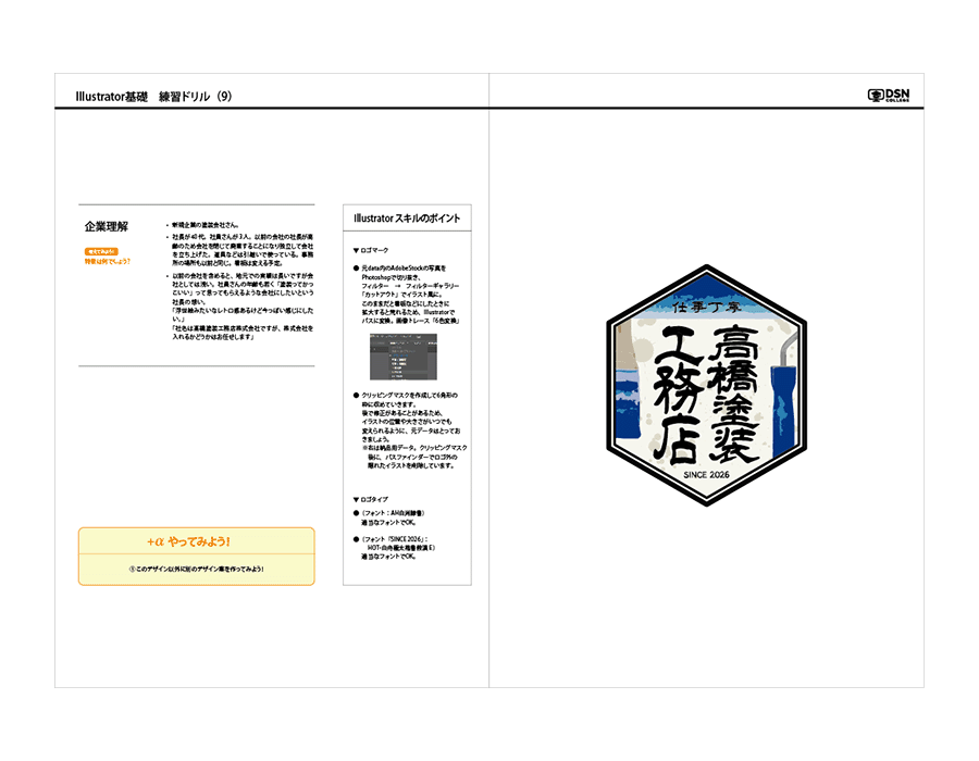 DSNカレッジの「Illustrator基礎」は、パスを自由に扱えるなどIllustratorの基本操作はひととおりできる方を対象としています。実際の練習ドリル01はこちら[PDF]になります。一般的なIllustrator解説書籍のようなやさしい解説はなく練習ドリル01はこれのみになります。内容をご確認いただき、できそうであればお申し込みをお願いします。